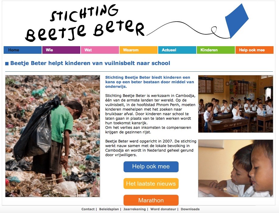 Met trots lanceren wij onze nieuwe website! Tegelijk doen we afstand van onze oude site, met de vele, vrolijke kleuren en korte rake teksten. Destijds heel beeldend. Anno 2016 worden van een website andere dingen gevraagd: goed vindbaar, snel, makkelijk aanpasbaar en geoptimaliseerd voor mobiele apparaten. Daarin hebben wij nooit in willen investeren. Wij besteden liever het geld van onze sponsors en donateurs aan onze doelen in Cambodja.
